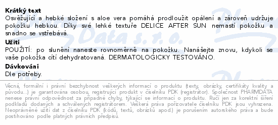 Osvěžující a hebké složení s aloe vera pomáhá prodloužit opálení a zároveň udržuje pokožku hebkou. Díky své lehké textuře DELICE AFTER SUN nemastí pokožku a snadno se vstřebává.