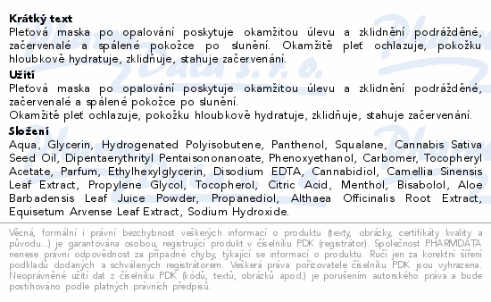 Pleťová maska po opalování poskytuje okamžitou úlevu a zklidnění podrážděné, začervenalé a spálené pokožce po slunění. Okamžitě pleť ochlazuje, pokožku hloubkově hydratuje, zklidňuje, stahuje začervenání.
