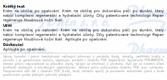 Krém na obličej po opalování. Krém na obličej pro dokonalou péči po slunění, který nabízí komplexní regenerační a hydratační účinky. Díky patentované technologii Repair regeneruje hloubkově kožní tkáň.