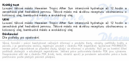 Luxusní tělové máslo Hawaiian Tropic After Sun intenzivně hydratuje až 12 hodin a zanechává pleť hedvábně jemnou. Tělové máslo má skvělou recepturu obohacenou o kokosový olej, bambucké máslo a avokádový olej.
