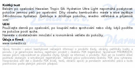 Balzám po opalování Hawaiian Tropic Silk Hydration Ultra Light napomáhá poskytovat pokožce jemnou péči po opalování. Díky obsahu bambuckého másla a aloe zajišťuje 24hodinovou hydrataci. Zjemňuje a zklidňuje pokožku, snadno vstřebává a příjemně voní