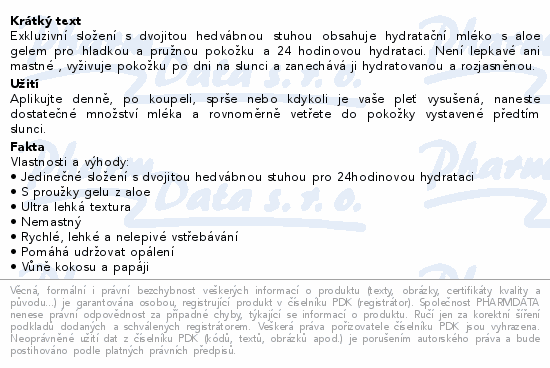 Exkluzivní složení s dvojitou hedvábnou stuhou obsahuje hydratační mléko s aloe gelem pro hladkou a pružnou pokožku a 24 hodinovou hydrataci. Není lepkavé ani mastné , vyživuje pokožku po dni na slunci a zanechává ji hydratovanou a rozjasněnou.