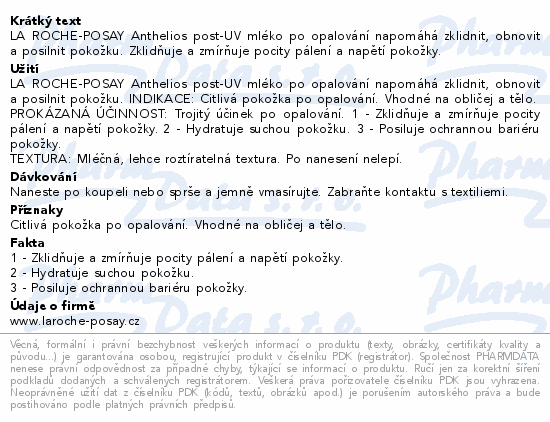 LA ROCHE-POSAY Anthelios post-UV mléko po opalování napomáhá zklidnit, obnovit a posilnit pokožku. Zklidňuje a zmírňuje pocity pálení a napětí pokožky.