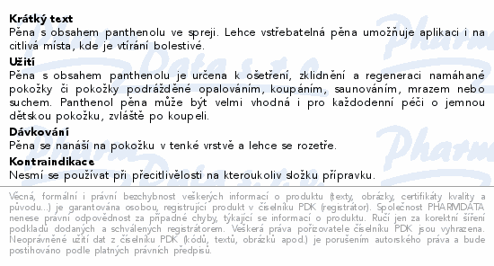Pěna s obsahem panthenolu ve spreji. Lehce vstřebatelná pěna umožňuje aplikaci i na citlivá místa, kde je vtírání bolestivé.