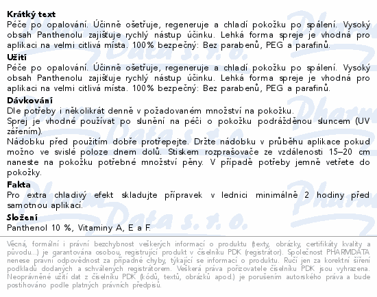 Péče po opalování. Účinně ošetřuje, regeneruje a chladí pokožku po spálení. Vysoký obsah Panthenolu zajišťuje rychlý nástup účinku. Lehká forma spreje je vhodná pro aplikaci na velmi citlivá místa. 100% bezpečný: Bez parabenů, PEG a parafinů.