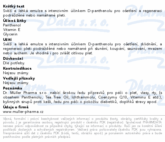 Svěží a lehká emulze s intenzivním účinkem D-panthenolu pro ošetření a regeneraci podrážděné nebo namáhané pleti.