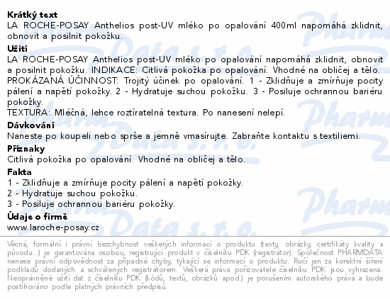 LA ROCHE-POSAY Anthelios post-UV mléko po opalování 400ml napomáhá zklidnit, obnovit a posilnit pokožku.