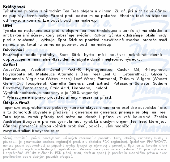 Tyčinka na pupínky s přírodním Tea Tree olejem a vilínem. Zklidňující a chladivý účinek na pupínky, černé tečky. Působí proti bakteriím na pokožce. Vhodná také na štípance od hmyzu a komárů. Lze použít pod i na make-up.