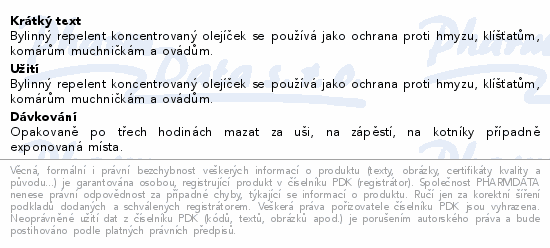 Bylinný repelent koncentrovaný olejíček se používá jako ochrana proti hmyzu, klíšťatům, komárům muchničkám a ovádům.