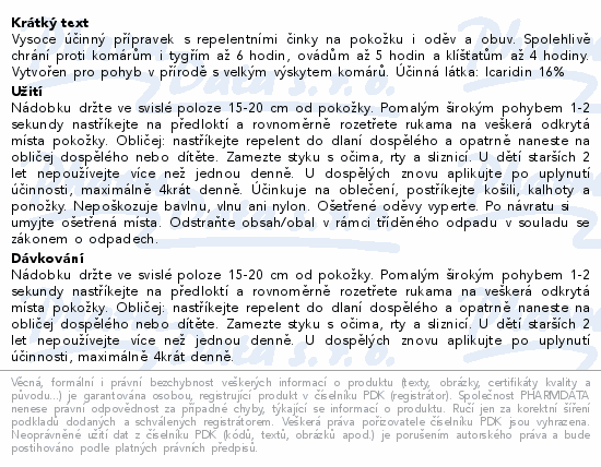 Vysoce účinný přípravek s repelentními činky na pokožku i oděv a obuv. Spolehlivě chrání proti komárům i tygřím až 6 hodin, ovádům až 5 hodin a klíšťatům až 4 hodiny. Vytvořen pro pohyb v přírodě s velkým výskytem komárů. Účinná látka: Icaridin 16%
