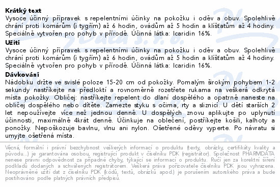 Vysoce účinný přípravek s repelentními účinky na pokožku i oděv a obuv. Spolehlivě chrání proti komárům (i tygřím) až 6 hodin, ovádům až 5 hodin a klíšťatům až 4 hodiny. Speciálně vytvořen pro pohyb v přírodě. Účinná látka: Icaridin 16%.
