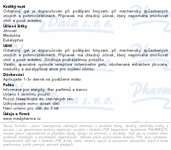MedPharma Octanový gel NATURAL se používá při poštípání hmyzem, dále při mechanicky způsobených otocích a pohmožděninách. Jeho chladivý účinek pomáhá zmírnit otok a svědění pokožky. Gel se rychle vstřebává a nezanechává mastný film.