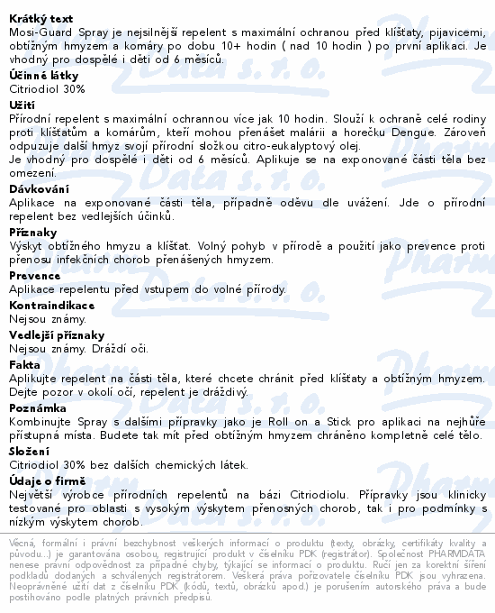 Mosi-Guard Spray je nejsilnější repelent s maximální ochranou před klíšťaty, pijavicemi, obtížným hmyzem a komáry po dobu 10+ hodin ( nad 10 hodin ) po první aplikaci. Je vhodný pro dospělé i děti od 6 měsíců.
