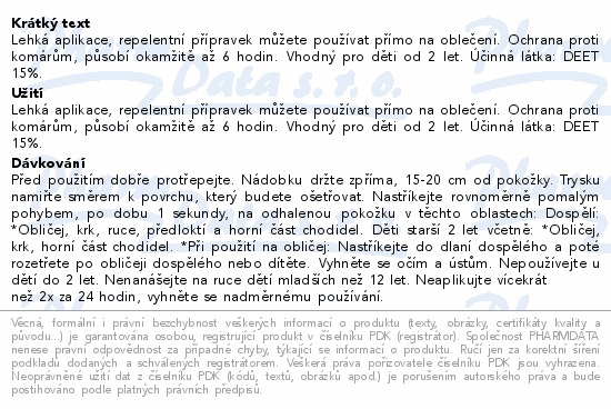 Spray OFF je zaručenou ochranou proti dotěrnému hmyzu(komáři, klíšťata). Obsahuje účinnou látku DEET.