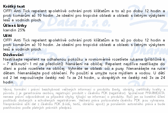 OFF! Anti Tick repelent spolehlivě ochrání proti klíšťatům a to až po dobu 12 hodin a proti komárům až 10 hodin. Je ideální pro tropické oblasti a oblasti s četným výskytem lesů a vodních ploch.