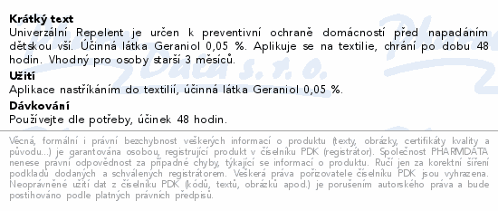 Univerzální Repelent je určen k preventivní ochraně domácností před napadáním dětskou vší. Účinná látka Geraniol 0,05 %. Aplikuje se na textilie, chrání po dobu 48 hodin. Vhodný pro osoby starší 3 měsíců.