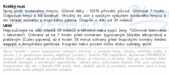 Sprej proti bodavému hmyzu. Účinné látky - 100% přírodní původ. Účinnost 7 hodin. Odpuzuje hmyz a tiší bodnutí. Vhodný do zón s vysokým výskytem bodavého hmyzu a do oblastí mírného a tropického pásma. Dospělí + děti od 30 měsíců.