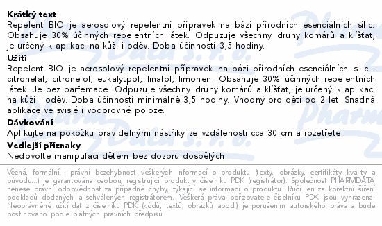Repelent Predator BIO sprej je přírodní ochranný přípravek proti komárům a klíšťatům, vyvinutý na bázi přírodních esenciálních silic. Obsahuje účinnou látku Citriodiol (olej z eukalyptu citrónového), která je známá svými repelentními účinky a představuje šetrnou alternativu k syntetickým látkám, jako je DEET. Je vhodný pro dospělé a děti od 2 let. Predator bio je určený k aplikaci na kůži, oděv i obuv. Díky 360° ventilu se může aplikovat v jakékoli poloze rozprašovače. Není parfemován, ale voní přirozenou citrusovou vůní.