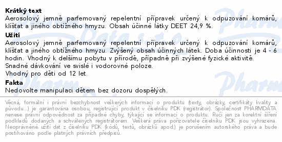 Repelent PREDATOR FORTE spray je vysoce účinný repelent určený k ochraně proti komárům, klíšťatům a dalšímu bodavému hmyzu. Obsahuje účinnou látku DEET (24,9 %), která poskytuje spolehlivou ochranu i v náročných podmínkách, například v lese nebo u vody. Díky silné koncentraci účinné látky poskytuje dlouhodobou ochranu až na 4 hodiny. Přípravek je určený pro dospělé a děti od 12 let. Díky 360° ventilu umožňuje dávkování ve svislé i vodorovné poloze, a to jak na pokožku, tak i na oděv nebo obuv.