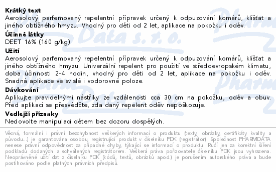 Aerosolový parfemovaný repelentní přípravek určený k odpuzování komárů, klíšťat a jiného obtížného hmyzu. Vhodný pro děti od 2 let, aplikace na pokožku i oděv.