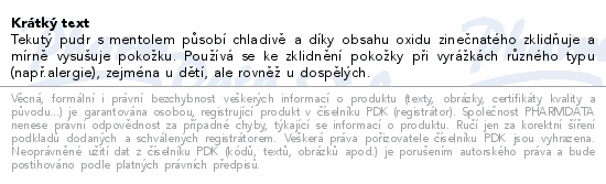 Tekutý pudr s mentolem působí chladivě a díky obsahu oxidu zinečnatého zklidňuje a mírně vysušuje pokožku. Používá se ke zklidnění pokožky při vyrážkách různého typu (např.alergie), zejména u dětí, ale rovněž u dospělých.