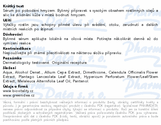 Sérum po pobodání hmyzem. Bylinný přípravek s vysokým obsahem rostlinných olejů a silic ke zklidnění kůže v místě bodnutí hmyzem.