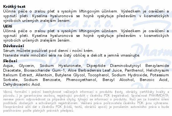 Účinná péče o zralou pleť s vysokým liftingovým účinkem. Výsledkem je osvěžení a vypnutí pleti. Kyselina hyaluronová se hojně vyskytuje především v kosmetických výrobcích určených zralejším ženám.