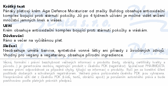 Pánský pleťový krém Age Defence Moisturizer od značky Bulldog obsahuje antioxidační komplex bojující proti stárnutí pokožky. Již po 4 týdnech užívání je možné vidět snížení množství jemných linek a vrásek.