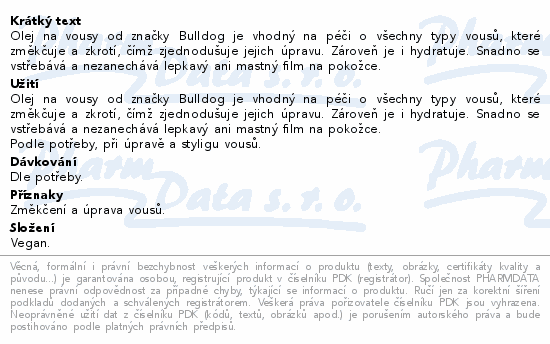 Olej na vousy od značky Bulldog je vhodný na péči o všechny typy vousů, které změkčuje a zkrotí, čímž zjednodušuje jejich úpravu. Zároveň je i hydratuje. Snadno se vstřebává a nezanechává lepkavý ani mastný film na pokožce.