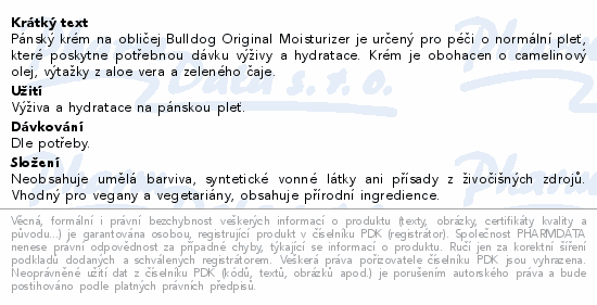 Pánský krém na obličej Bulldog Original Moisturizer je určený pro péči o normální pleť, které poskytne potřebnou dávku výživy a hydratace. Krém je obohacen o camelinový olej, výtažky z aloe vera a zeleného čaje.