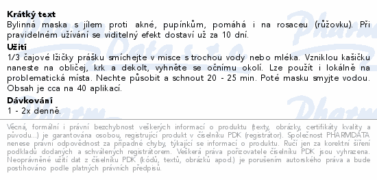 Bylinná maska s jílem proti akné, pupínkům, pomáhá i na rosaceu (růžovku). Při pravidelném užívání se viditelný efekt dostaví už za 10 dní.