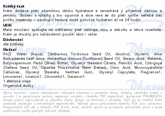 Krém dodává pleti okamžitou dávku hydratace a zanechává ji příjemně vláčnou a jemnou. Složení s výtažky z bio opuncie a aloe vera se do pleti rychle vstřebá bez pocitu mastnoty – osvěžující textura dodá pokožce hydrataci až na 24 hodin.