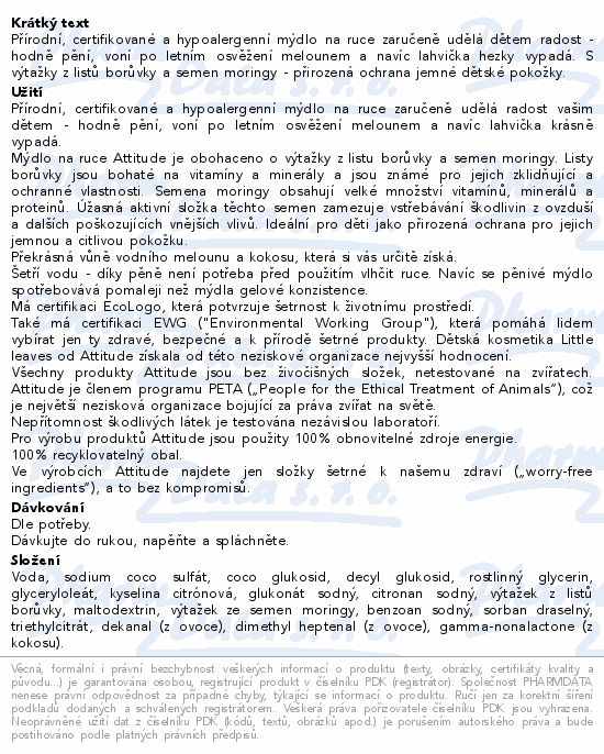 Přírodní, certifikované a hypoalergenní mýdlo na ruce zaručeně udělá dětem radost - hodně pění, voní po letním osvěžení melounem a navíc lahvička hezky vypadá. S výtažky z listů borůvky a semen moringy - přirozená ochrana jemné dětské pokožky.
