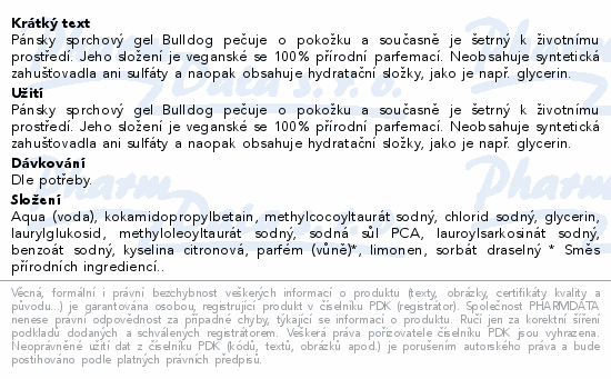 Pánsky sprchový gel Bulldog pečuje o pokožku a současně je šetrný k životnímu prostředí. Jeho složení je veganské se 100% přírodní parfemací. Neobsahuje syntetická zahušťovadla ani sulfáty a naopak obsahuje hydratační složky, jako je např. glycerin.
