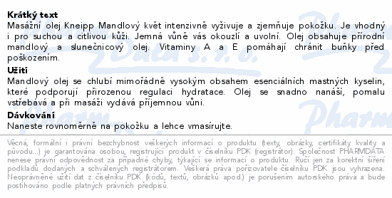 Masážní olej Kneipp Mandlový květ intenzivně vyživuje a zjemňuje pokožku. Je vhodný i pro suchou a citlivou kůži. Jemná vůně vás okouzlí a uvolní. Olej obsahuje přírodní mandlový a slunečnicový olej. Vitaminy A a E pomáhají chránit buňky před poškozením.