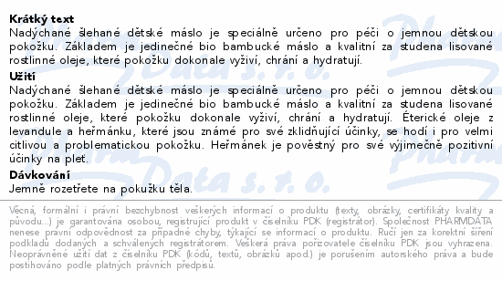 Nadýchané šlehané dětské máslo je speciálně určeno pro péči o jemnou dětskou pokožku. Základem je jedinečné bio bambucké máslo a kvalitní za studena lisované rostlinné oleje, které pokožku dokonale vyživí, chrání a hydratují.
