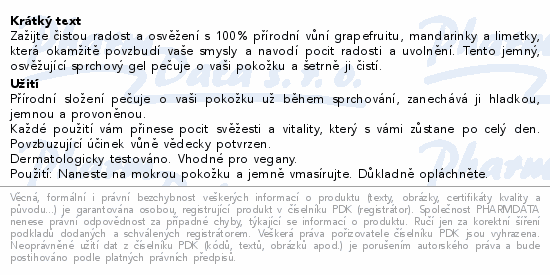 Užijte si příval energie se 100 % přírodní vůní grapefruitu, mandarinky a limetky. Vpusťte k sobě do koupelny letní náladu a zažijte čistou radost. Sprchový gel pečuje o vaše smysly a zároveň jemně myje pokožku díky obsahu rostlinných tenzidů.