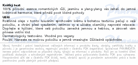 Zabalte se do 100 % přírodní vůně růže damašské, jasmínu a ylang ylang. Jemná květinová vůně vám přinese pocity pohody. Sprchový krém pečuje o vaši pokožku již ve sprše díky obsahu rostlinných olejů a chrání ji tak před vysušením.