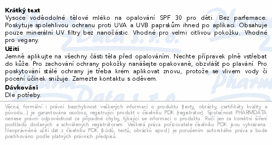 Vysoce voděodolné tělové mléko na opalování SPF 30 pro děti. Bez parfemace. Poskytuje spolehlivou ochranu proti UVA a UVB paprskům ihned po aplikaci. Obsahuje pouze minerální UV filtry bez nanočástic. Vhodné pro velmi citlivou pokožku. Vhodné pro vegany.