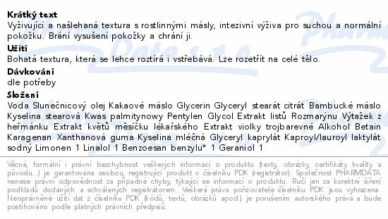 Vyživující a našlehaná textura s rostlinnými másly, intezivní výživa pro suchou a normální pokožku. Brání vysušení pokožky a chrání ji.