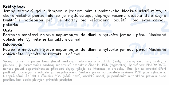 Jemný sprchový gel a šampon v jednom vám z praktického hlediska ušetří místo, z ekonomického peníze, ale co je nejdůležitější, dopřeje vašemu děťátku stále stejně kvalitní a potřebnou péči. Je vhodný pro každodenní použití i pro extra citlivou pokožku.
