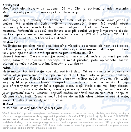 Meruňkový olej lisovaný za studena 100 ml. Olej je získávaný z jader meruňky. Meruňkový olej patří mezi luxusnější kosmetické oleje.