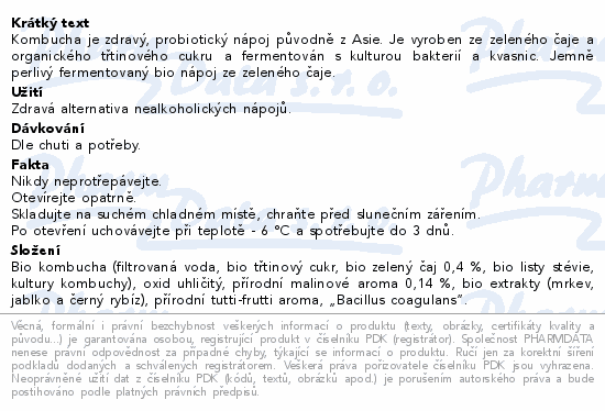 Kombucha je zdravý, probiotický nápoj původně z Asie. Je vyroben ze zeleného čaje a organického třtinového cukru a fermentován s kulturou bakterií a kvasnic. Jemně perlivý fermentovaný bio nápoj ze zeleného čaje.