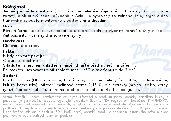 Jemně perlivý fermentovaný bio nápoj ze zeleného čaje s příchutí maliny. Kombucha je zdravý, probiotický nápoj původně z Asie. Je vyrobený ze zelného čaje, organického třtinového cukru, fermentováno s bakteriemi a droždím.