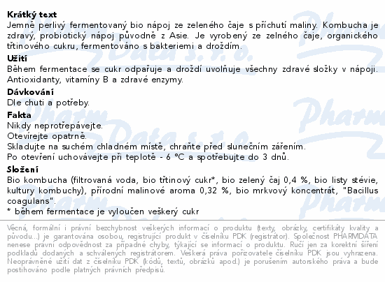 Jemně perlivý fermentovaný bio nápoj ze zeleného čaje s příchutí maliny. Kombucha je zdravý, probiotický nápoj původně z Asie. Je vyrobený ze zelného čaje, organického třtinového cukru, fermentováno s bakteriemi a droždím.