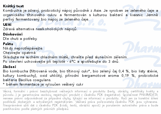 Kombucha je zdravý, probiotický nápoj původně z Asie. Je vyroben ze zeleného čaje a organického třtinového cukru a fermentován s kulturou bakterií a kvasnic. Jemně perlivý fermentovaný bio nápoj ze zeleného čaje.