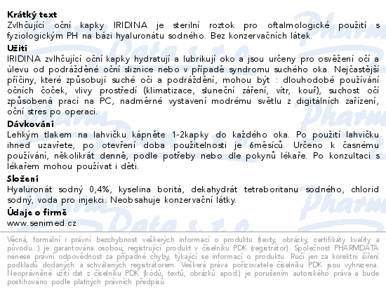 Zvlhčující oční kapky IRIDINA je sterilní roztok pro oftalmologické použití s fyziologickým PH na bázi hyaluronátu sodného. Bez konzervačních látek.