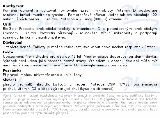 Pomáhá obnovit a udržovat rovnováhu střevní mikrobioty. Vitamin D podporuje správnou funkci imunitního systému. Pomerančová příchuť. Jedna tableta obsahuje 100 milionu živých bakterií L. reuteri Protectis a 20 mcg (800 IU) vitaminu D3.