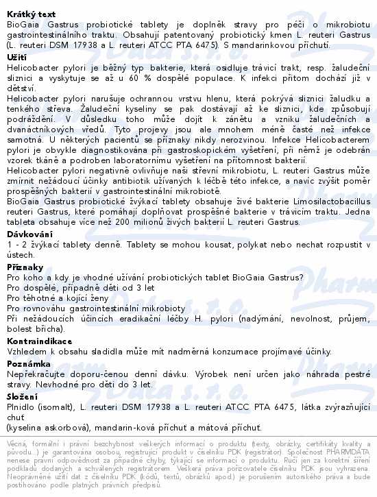 BioGaia Gastrus probiotické tablety je doplněk stravy pro péči o mikrobiotu gastrointestinálního traktu. Obsahují patentovaný probiotický kmen L. reuteri Gastrus (L. reuteri DSM 17938 a L. reuteri ATCC PTA 6475). S mandarinkovou příchutí.