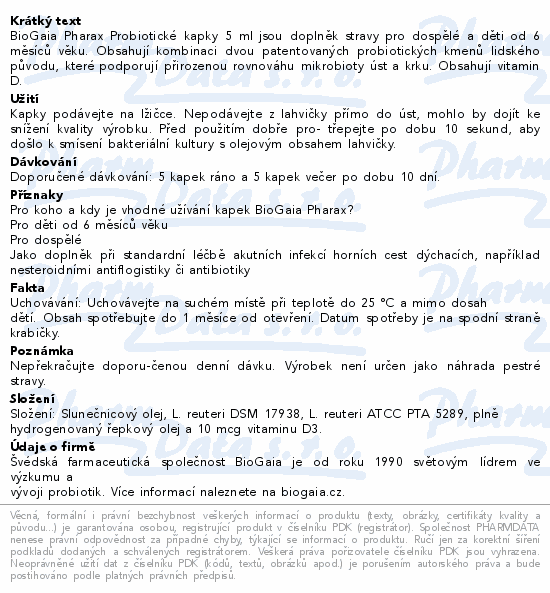 BioGaia Pharax Probiotické kapky 5 ml jsou doplněk stravy pro dospělé a děti od 6 měsíců věku. Obsahují kombinaci dvou patentovaných probiotických kmenů lidského původu, které podporují přirozenou rovnováhu mikrobioty úst a krku. Obsahují vitamin D.